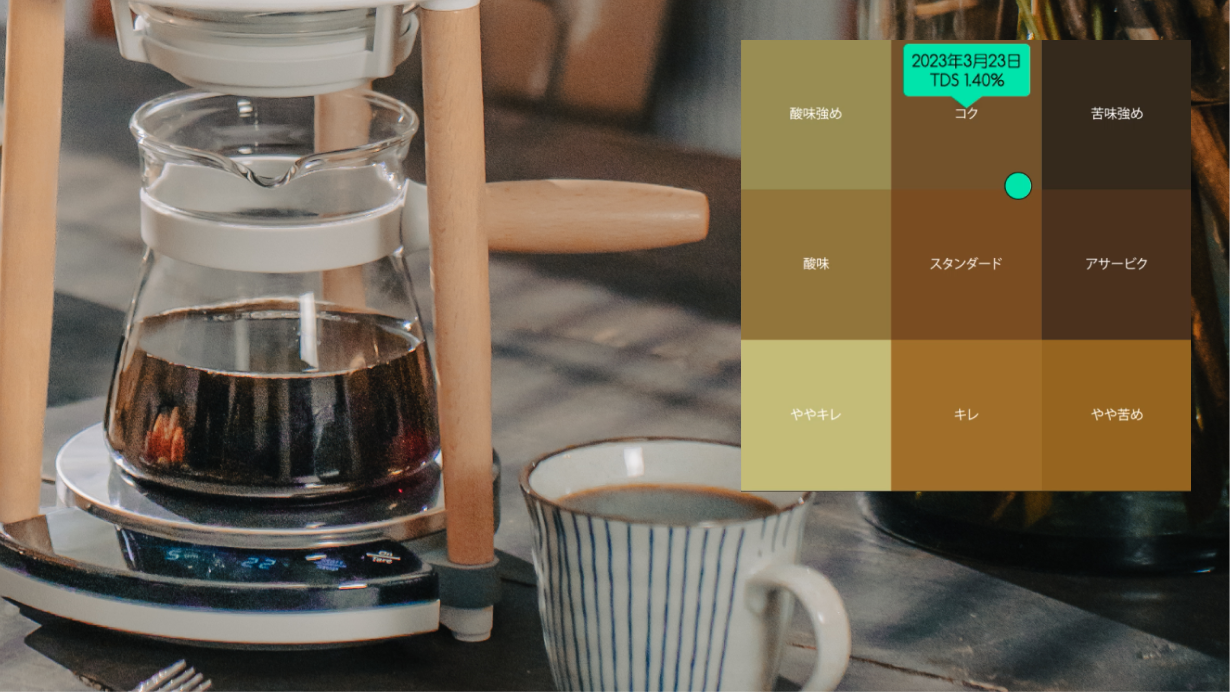 SCA(スペシャリティコーヒー協会)の基準に基づいて、9種類のテイストの中からドリップしたコーヒーがどこに位置するのか瞬時に表示します。どのように仕上がったのかや、自分の好みはどのテイストなのかを再確認することができます。