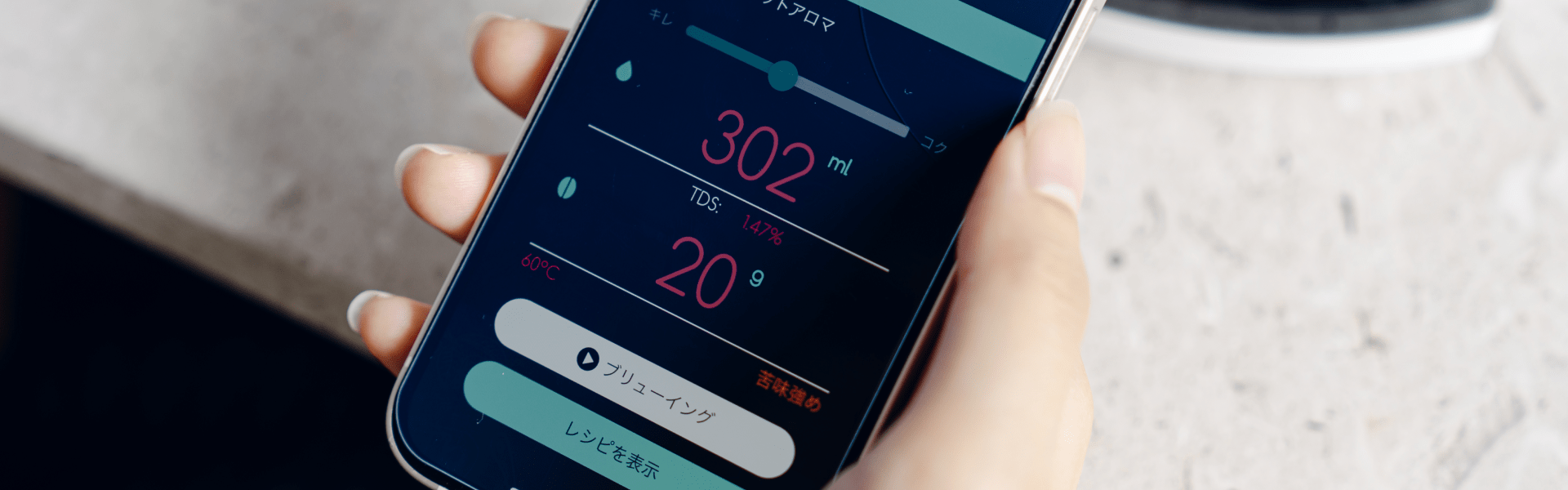 ワンタッチでBluetooth接続できる専用アプリを使用することで、必要なコーヒー粉やお湯の分量からお湯を落とすペースまでリアルタイムでサポートします。